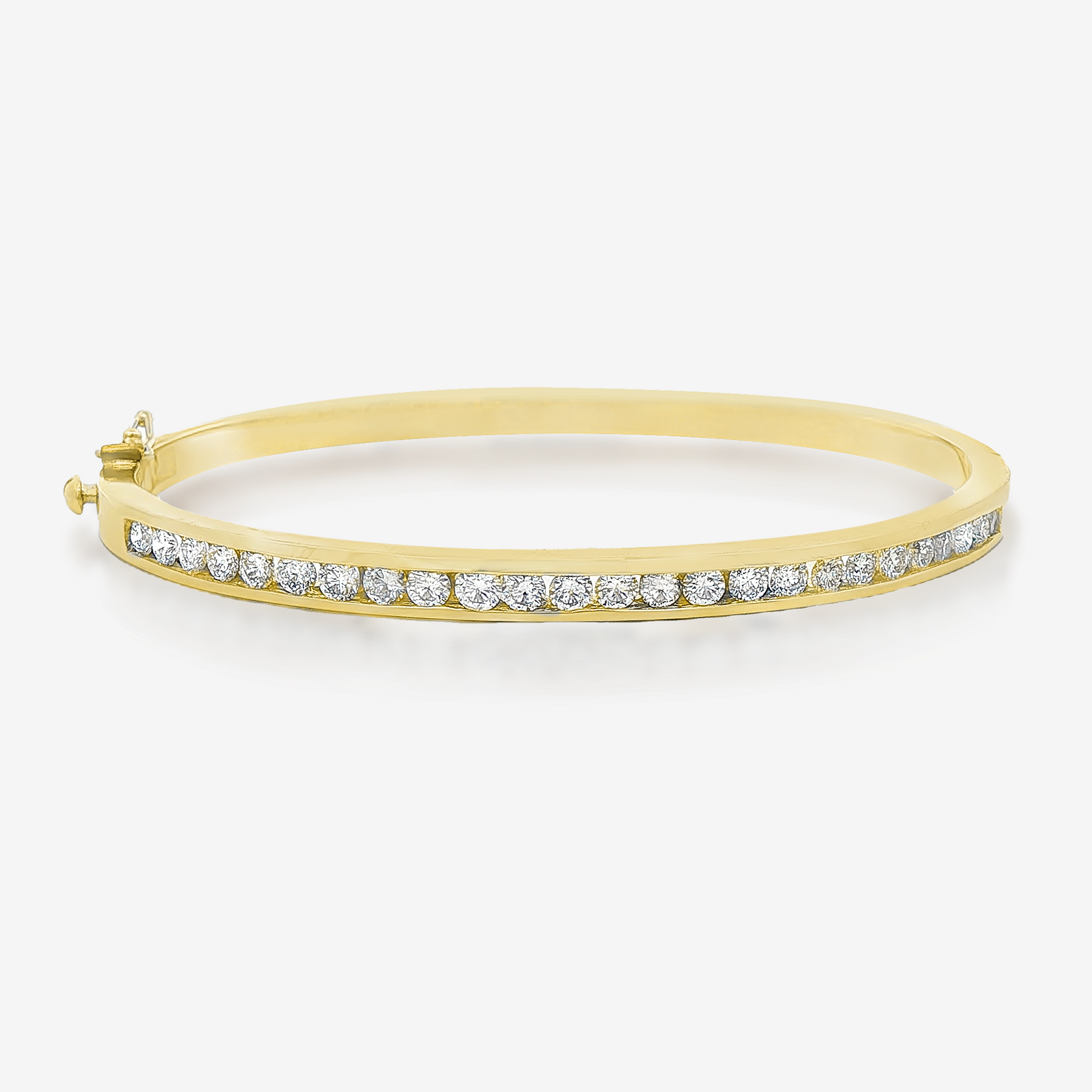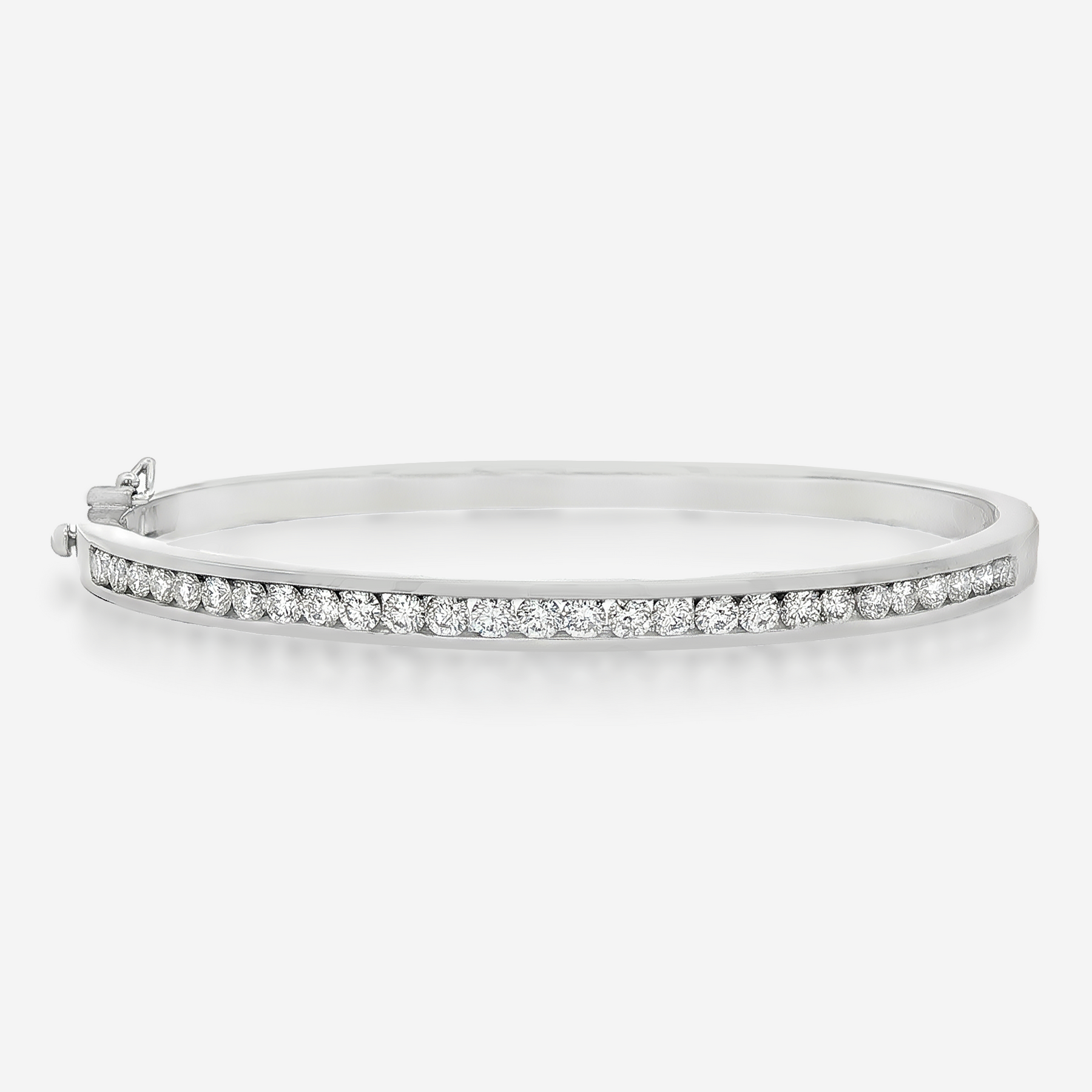 Catch everyone's eye with this stunning 14K white or yellow gold classic halfway channel set diamond bangle! Stack multiple bangles to customize your new favorite accessory for any look or occasion.