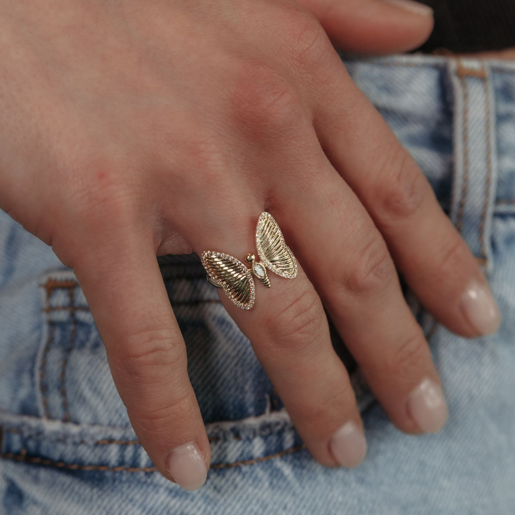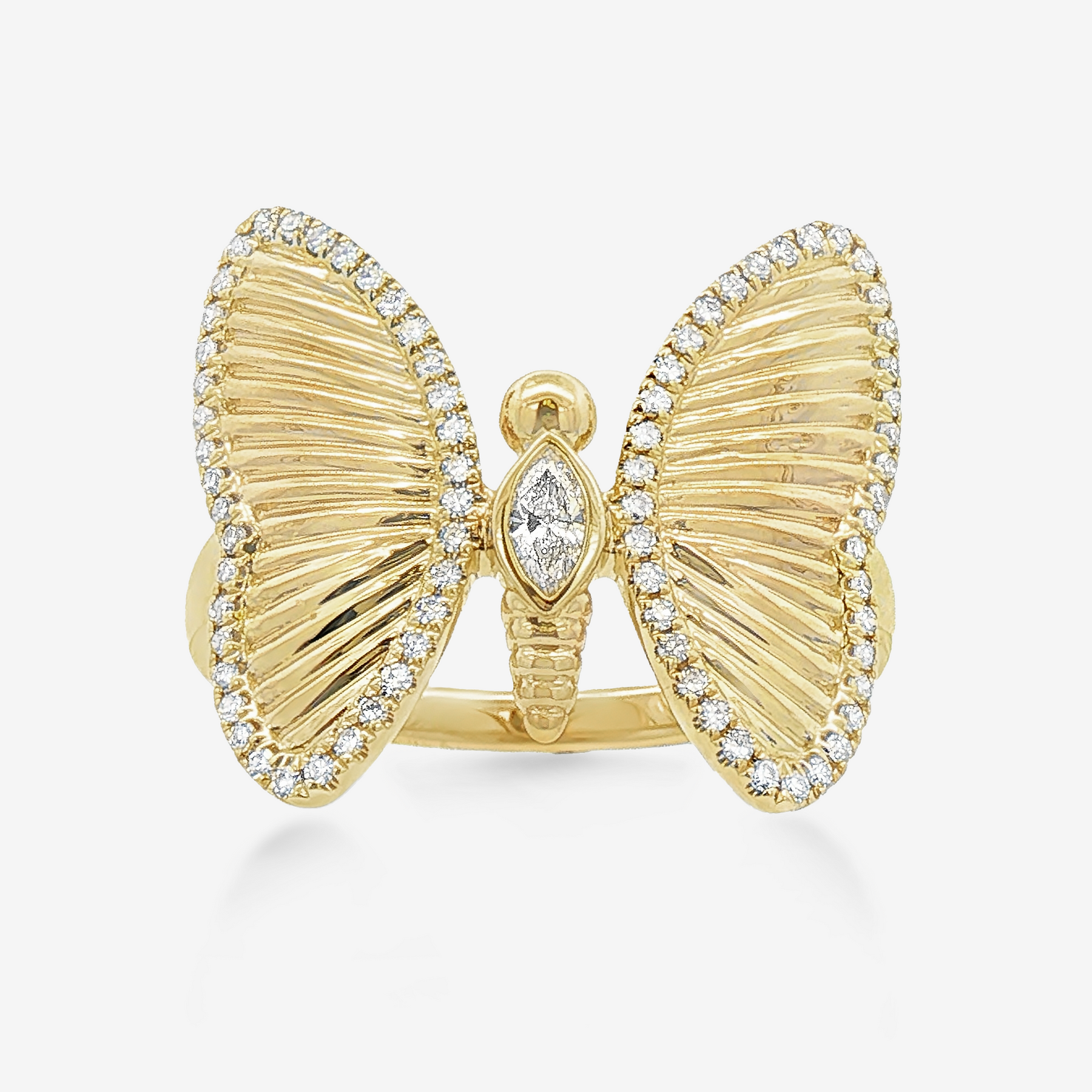 Crafted from glistening gold, its delicate butterfly wing design is playfully detailed with fluted textures and a brilliant marquise diamond body that catch the light beautifully. Perfect for those who love a bit of freedom and value living in the moment.