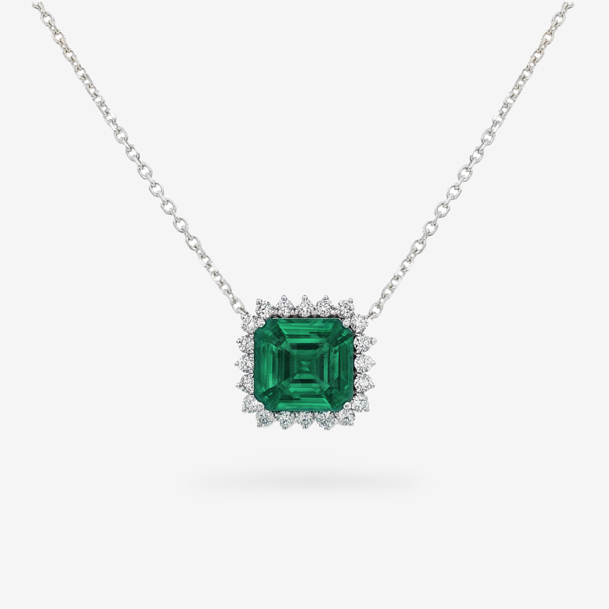 3.20CT Assher Cut Emerald & Diamond Halo Necklace