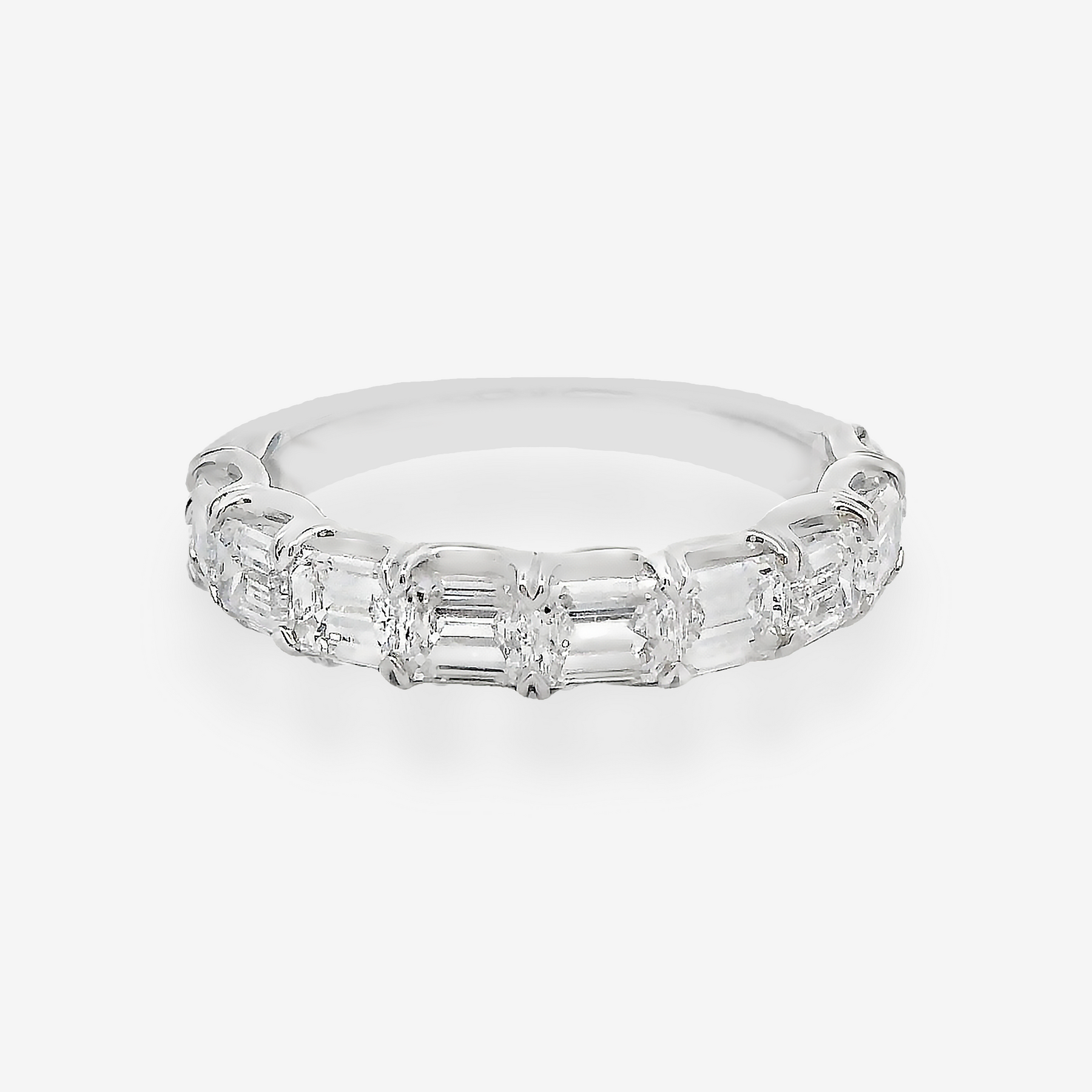 Tie the knot with style! This halfway emerald cut diamond band is your perfect partner in life. Not tying the knot? Not to worry! It’s a great stackable or solo option for your everyday needs. set in modern east/west setting that lets in the light from multiple angles.