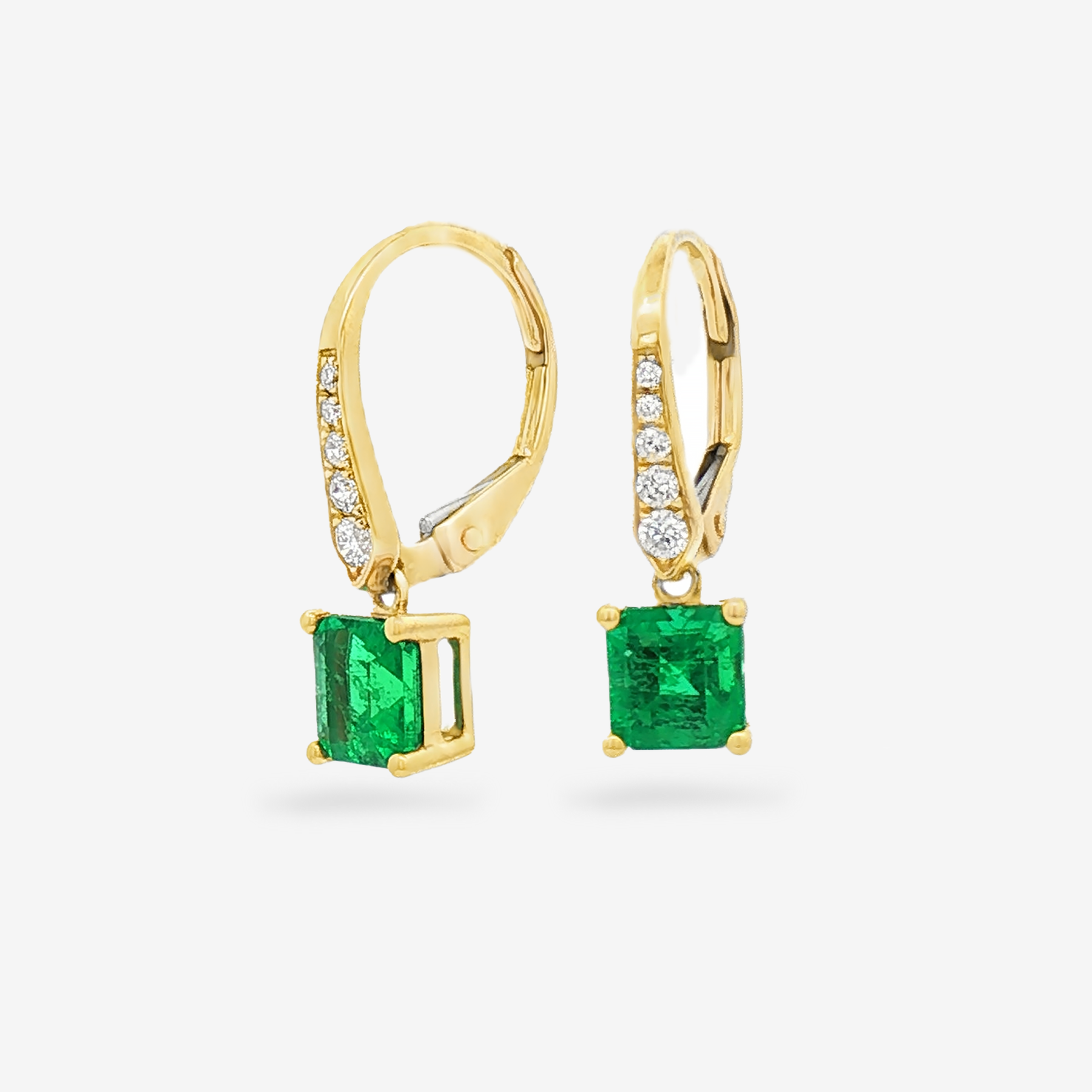 These lively drop earrings showcase emerald-cut emeralds paired with brilliant diamonds; all set in 18K yellow gold. Each lever-back earring swings with a vibrant green emerald, celebrated for its deep color and soothing vibes.