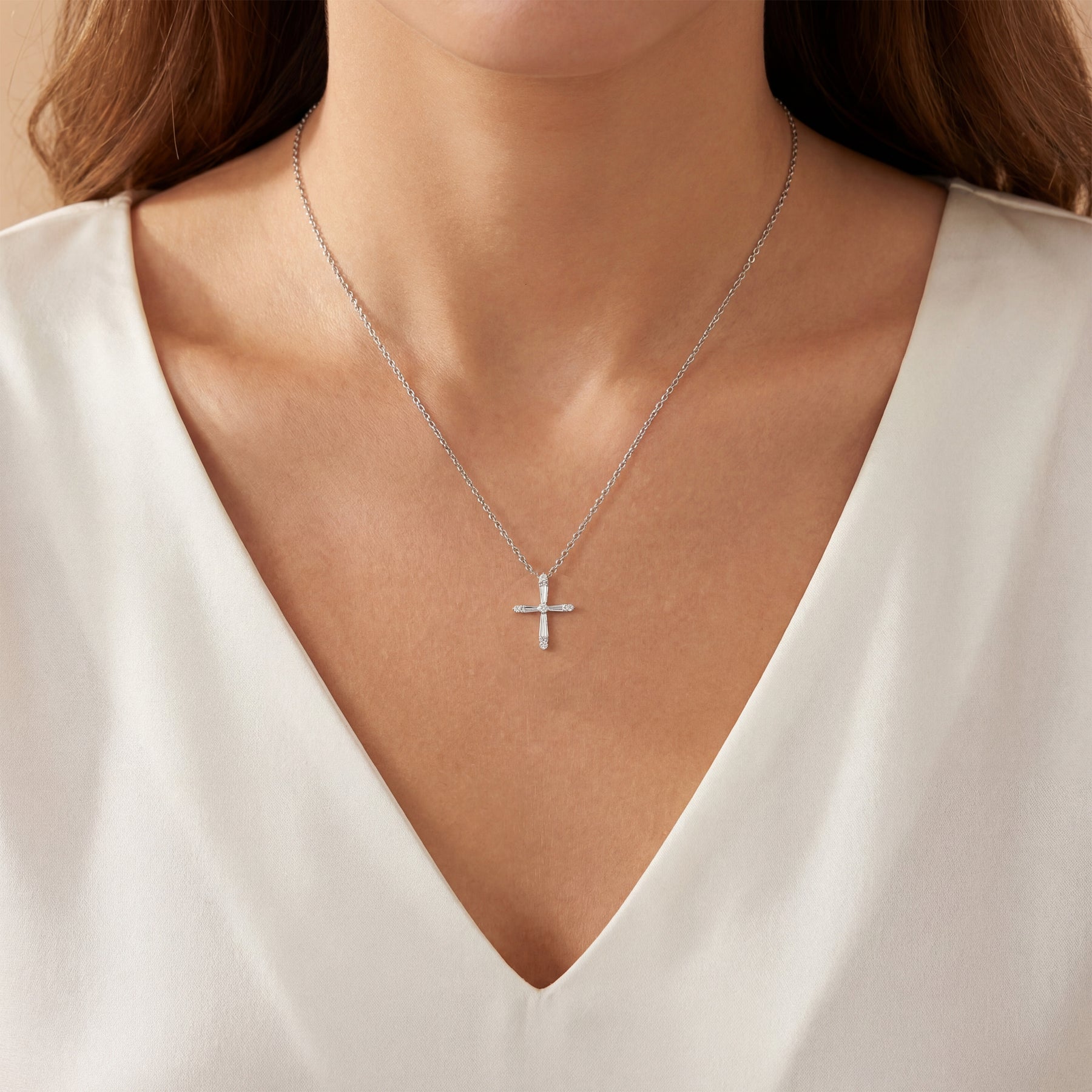 Our baguette and round brilliant-cut diamond cross necklace is a classic faith statement. Our craftsmen have made extra effort to ensure your diamonds stay safe and brilliant even with daily wear. Pair this with any of the devotional pieces in our Religious Collection.