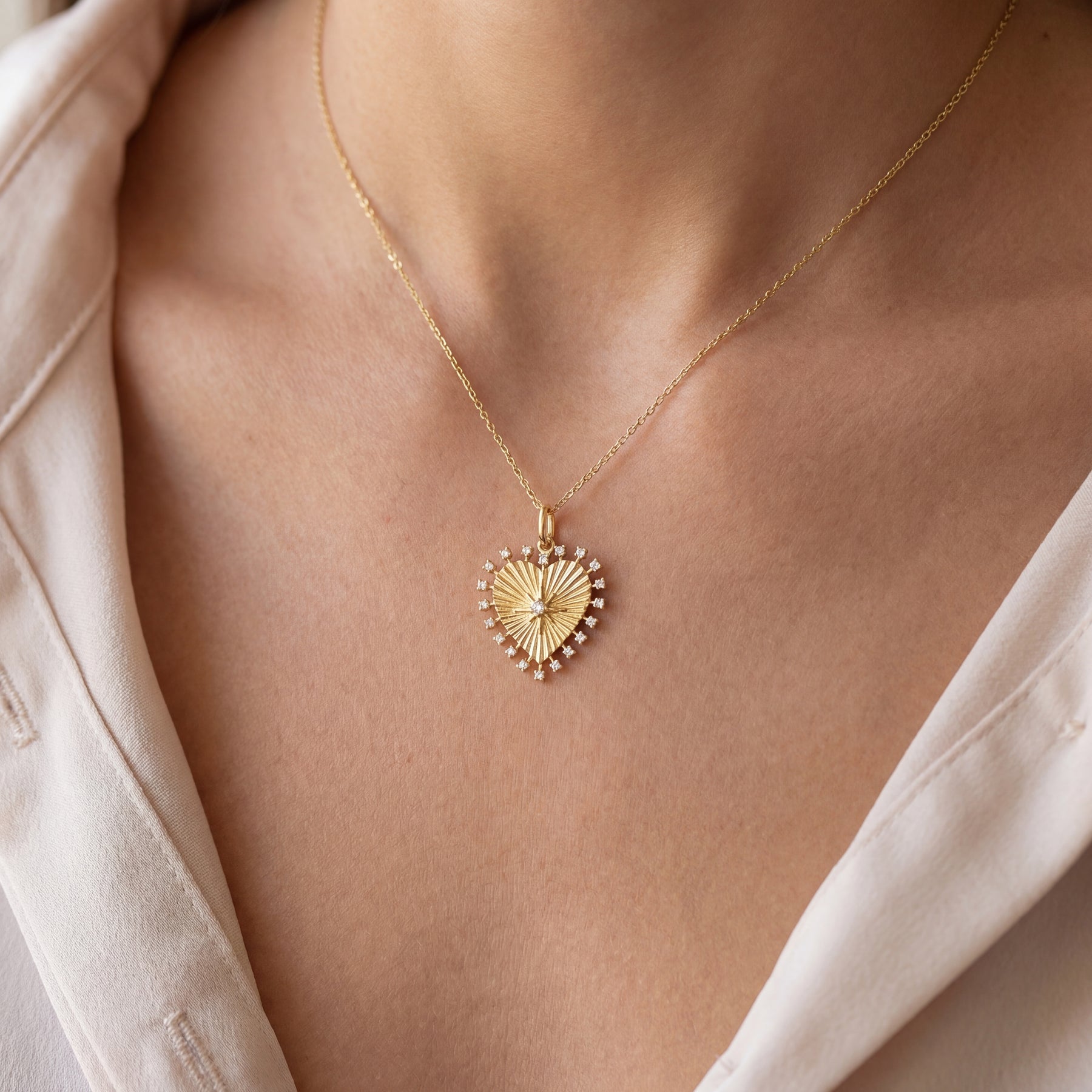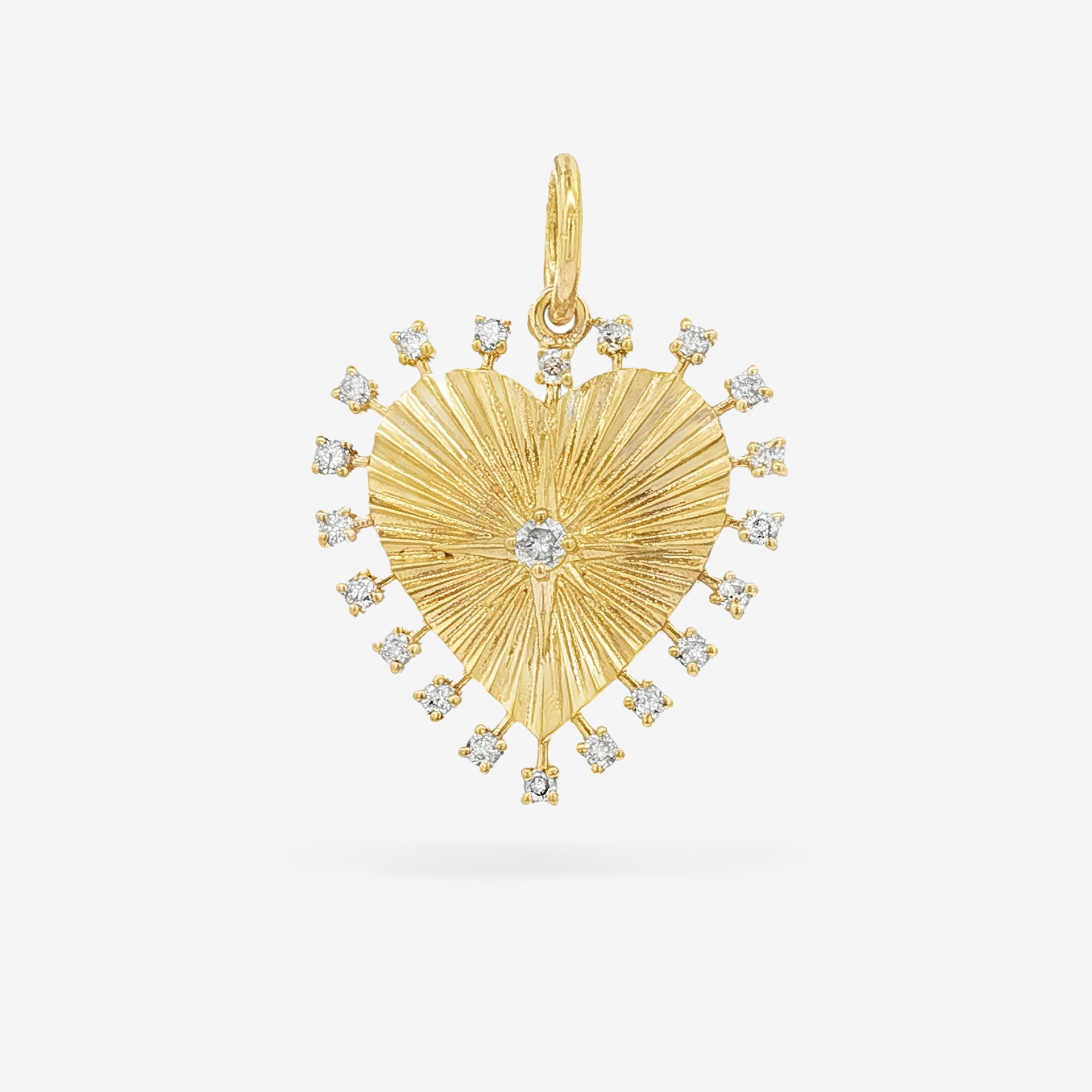 This fluted gold heart pendant, featuring prong set diamonds bursting along a gold border, offers a charmingly playful take on a timeless piece. The detailed fluted star pattern and round brilliant-cut diamond make it ideal for anyone eager to express their distinctive flair. Pairs effortlessly with any of our charm holder necklaces.
