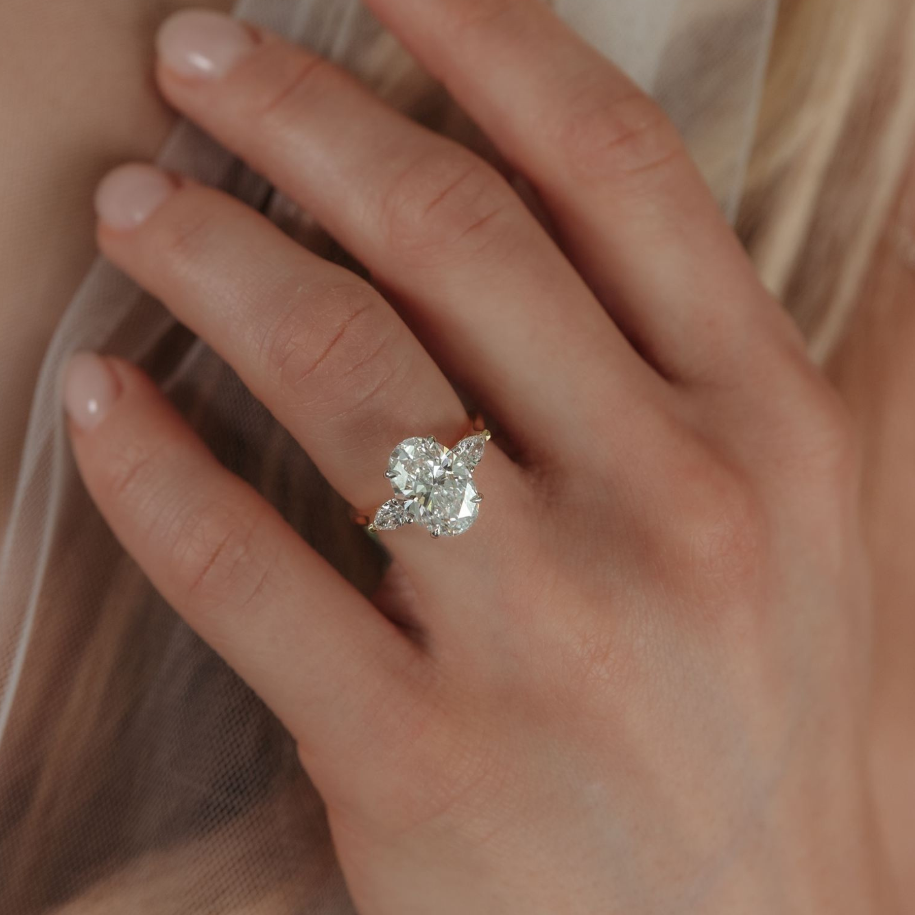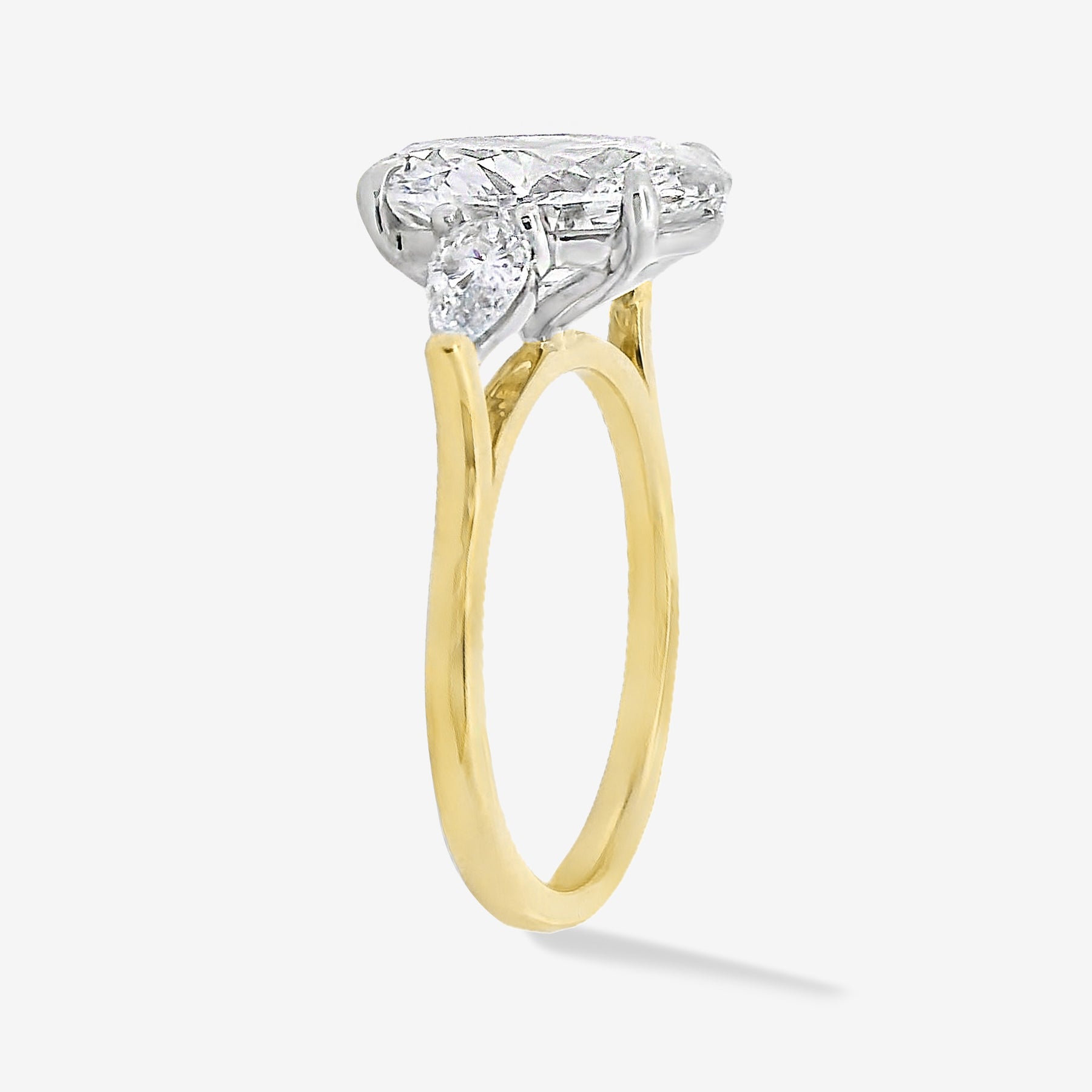 This Lab Grown Diamond 3 Stone Engagement Ring features an Oval Brilliant center and Pear shape side stone solitaires for added sparkle!