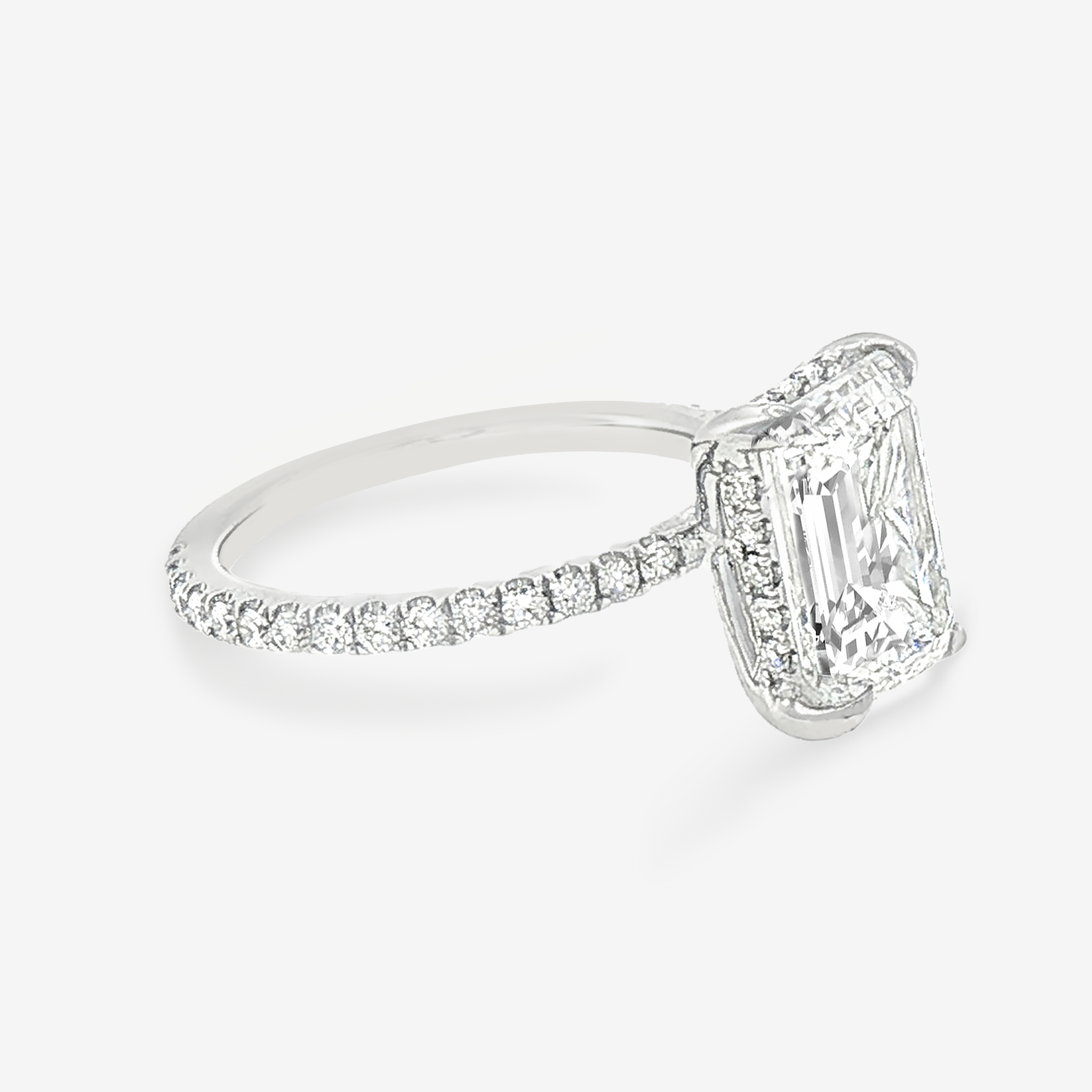 This Lab Grown Diamond in our Silhouette Collection, Emerald Cut Engagement Ring Features French set round diamonds and a Hidden Halo. Inspired by the Delicate collection we love, the Silhouette is a little more significant in diamond size and scale.