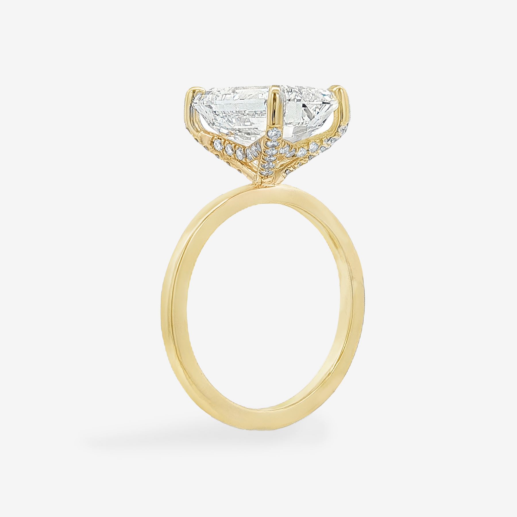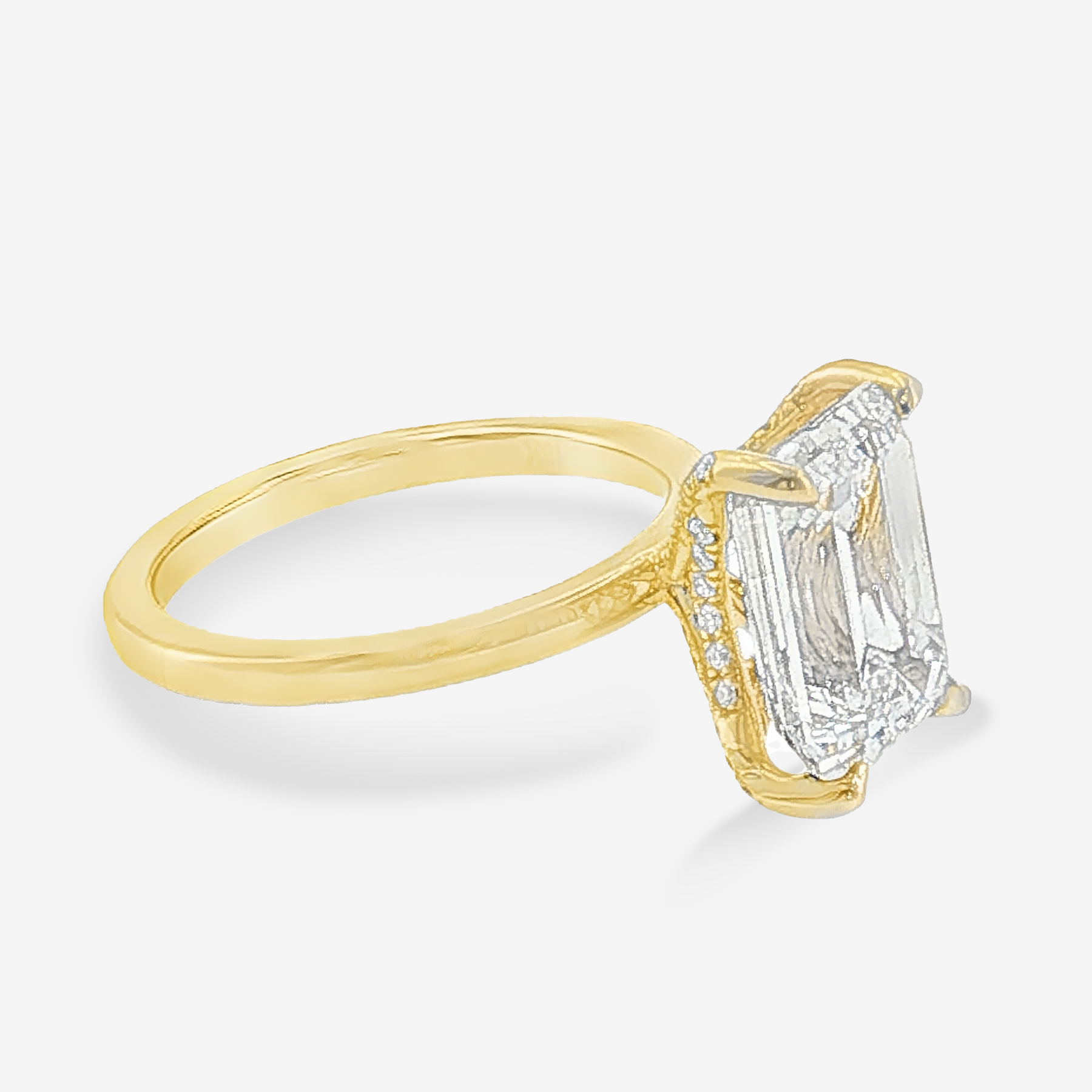 This Lab Grown Diamond is set in our Unique Hidden Halo Collection. An Emerald cut set above a discreet curved halo that follows the pavilion, with additional diamonds along the prongs, creating a refined, elevated profile with added dimension and detail.