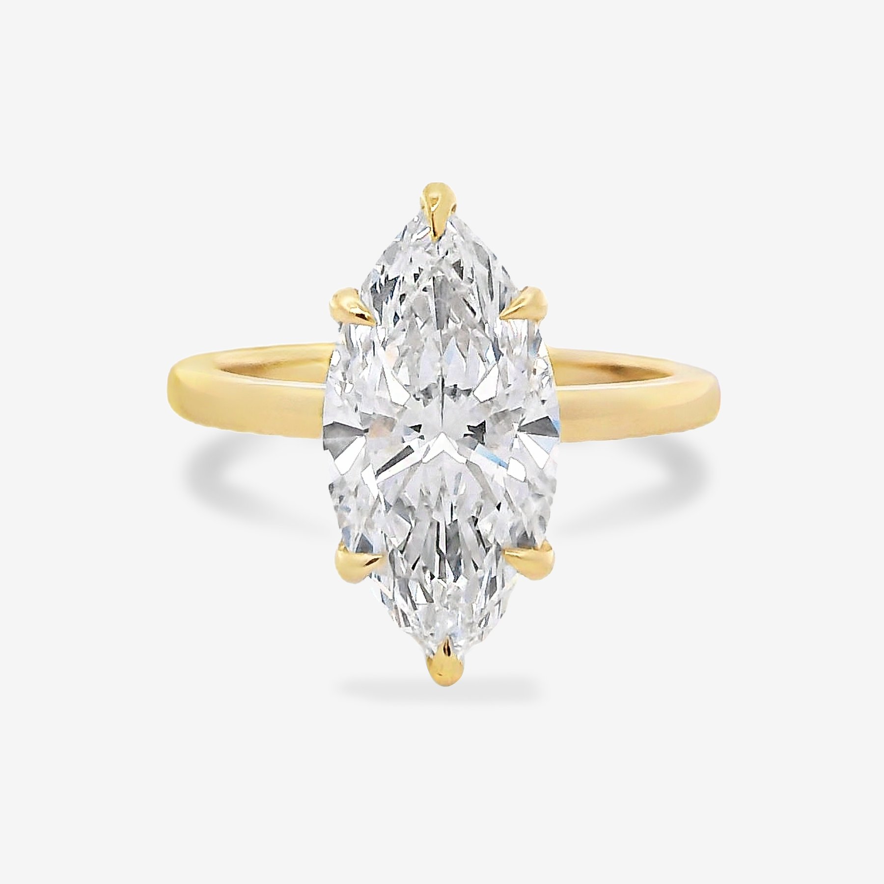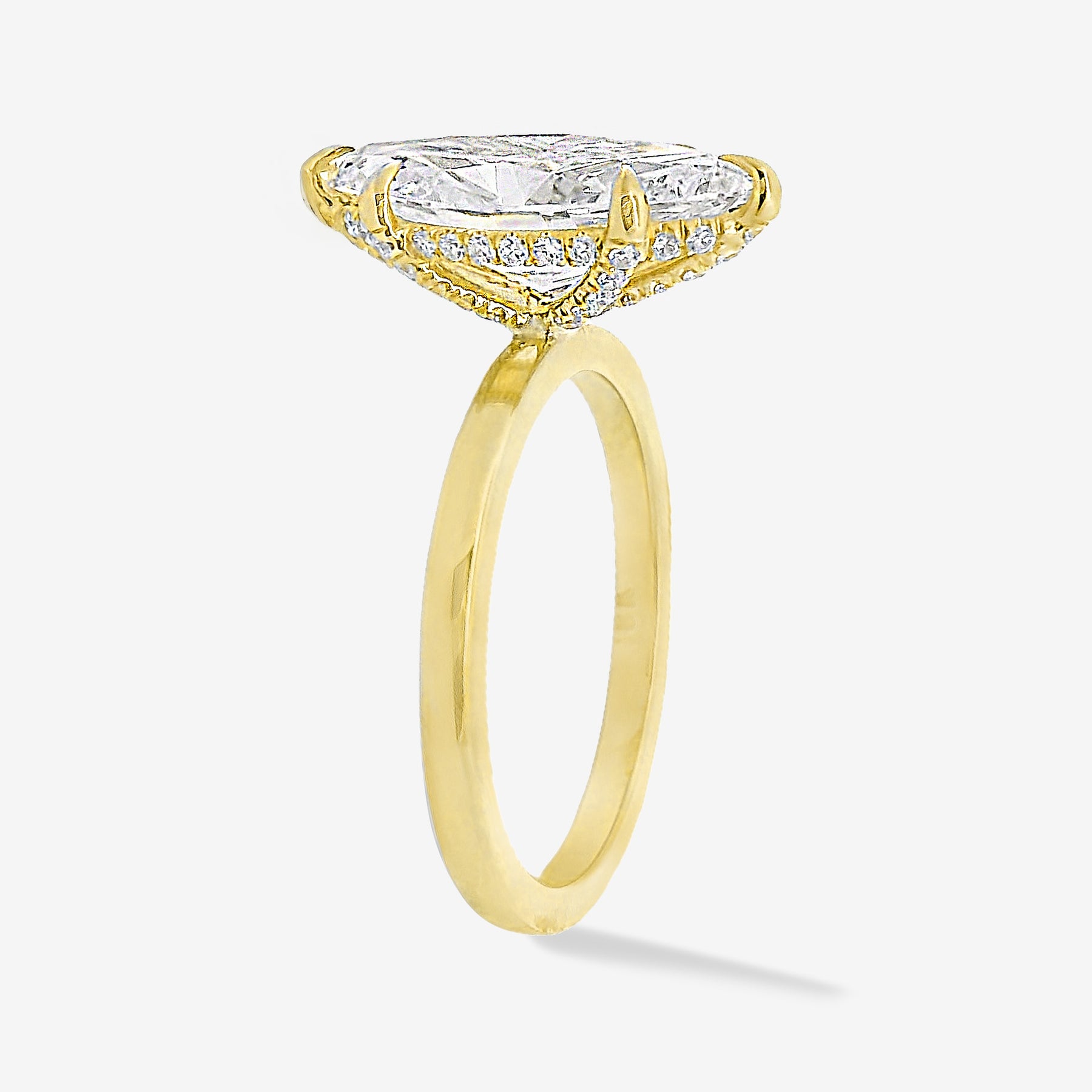 This Lab Grown Diamond our Cage Solitaire Collection, marquise engagement ring. Featuring pave' diamond prongs and a hidden halo set in 18K yellow gold. Accompanied by The Mavilo signature “Flush Fit” shank design assures that it will pair beautifully with your wedding band!