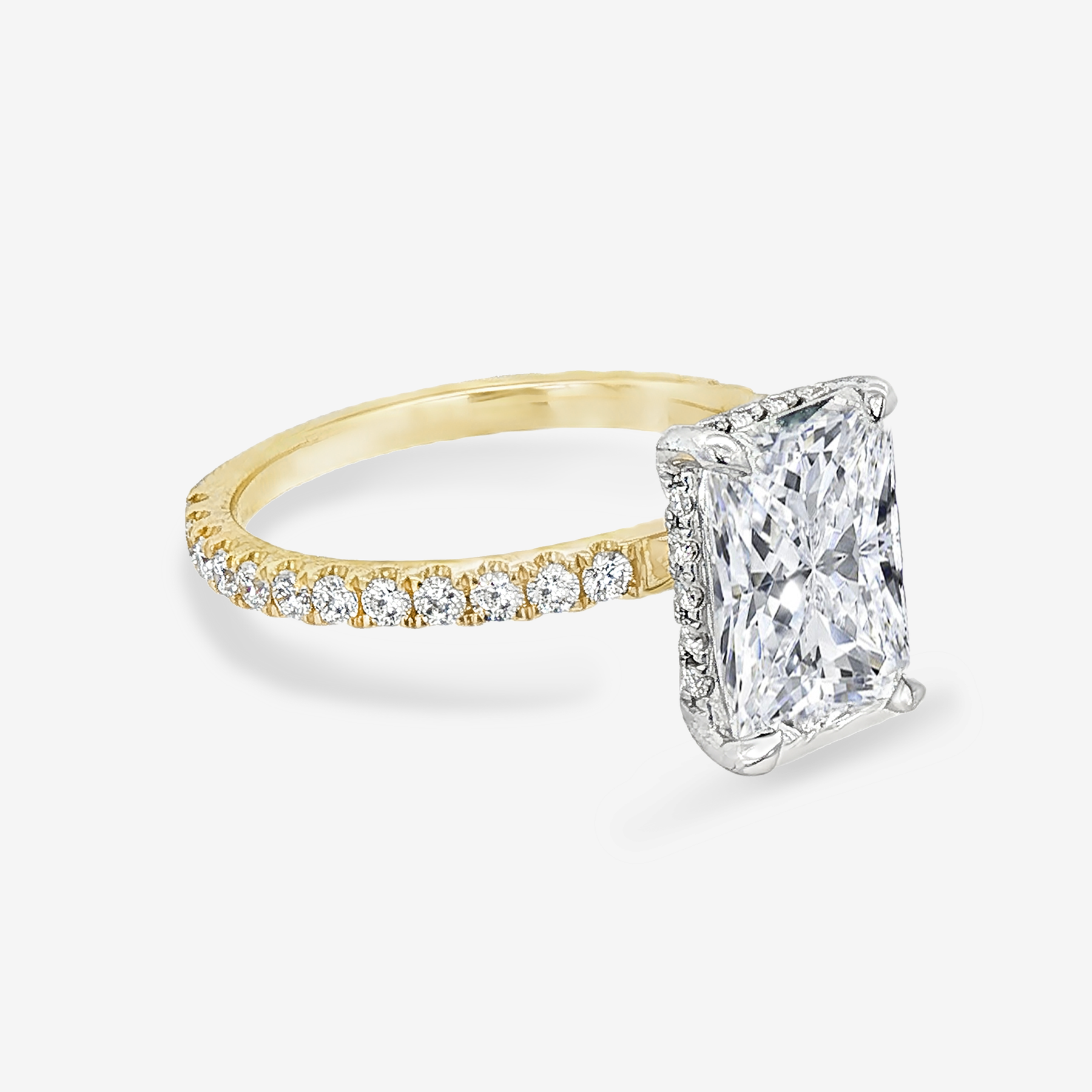 This Lab Grown Diamond in our Silhouette Collection, 18K gold radiant cut engagement ring features French set round diamonds and a Hidden Halo.  Inspired by the Delicate collection we love, the Silhouette is a little more significant in diamond size and scale.