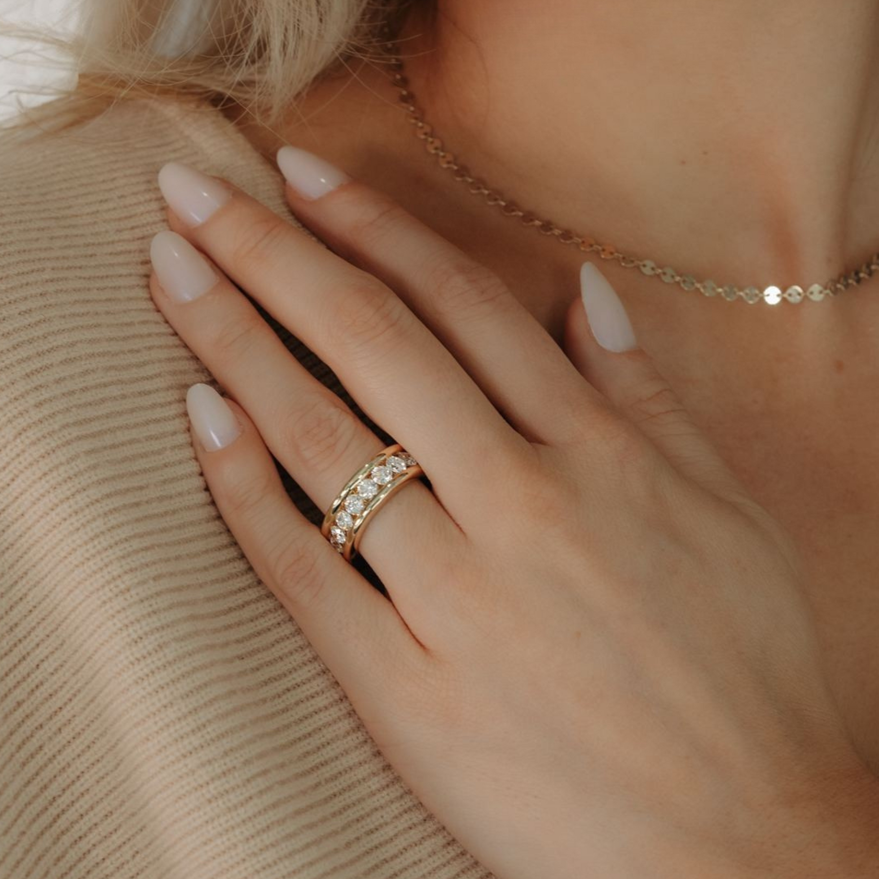 This dazzling wide channel diamond band features thirteen round brilliant cut diamonds nestled between two high-polished 14k yellow gold bands. Its bold design is your forever favorite piece, making it perfect for those who love a little extra touch of elegance.