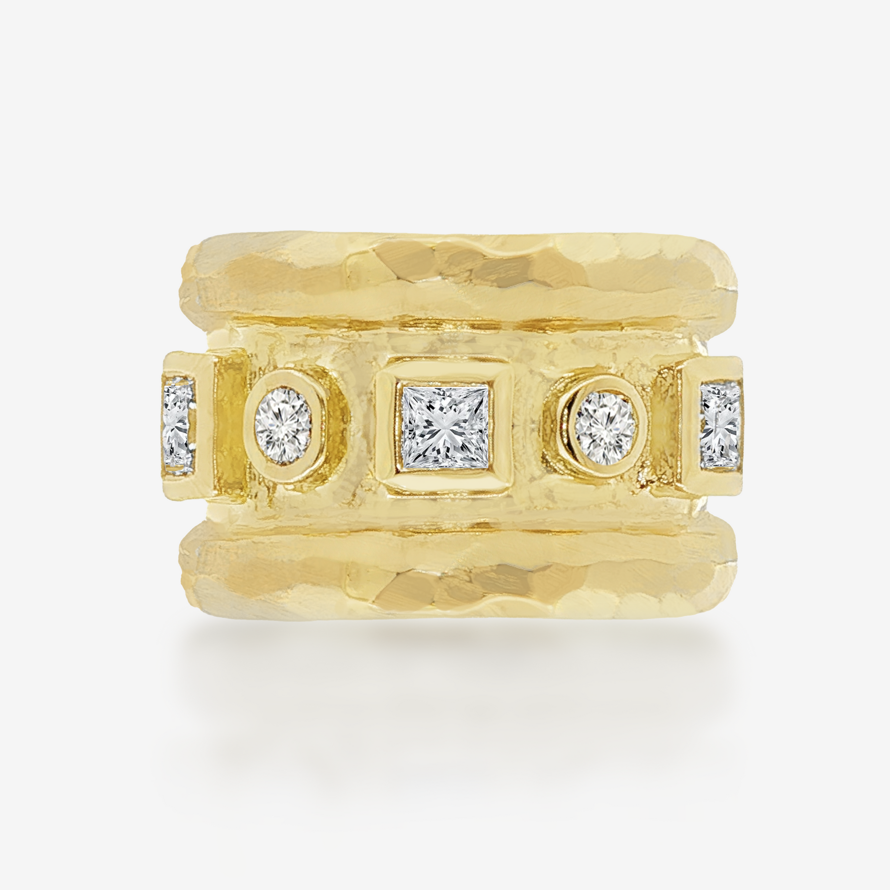 Elevate your everyday sparkle with this stunning Lab-Grown diamond ring that's anything but ordinary, featuring a gorgeous, hammered finish. This wide band beauty showcases princess cut and round diamonds. Perfect for those who want serious style with a playful twist—because why settle for boring when you can have bold?