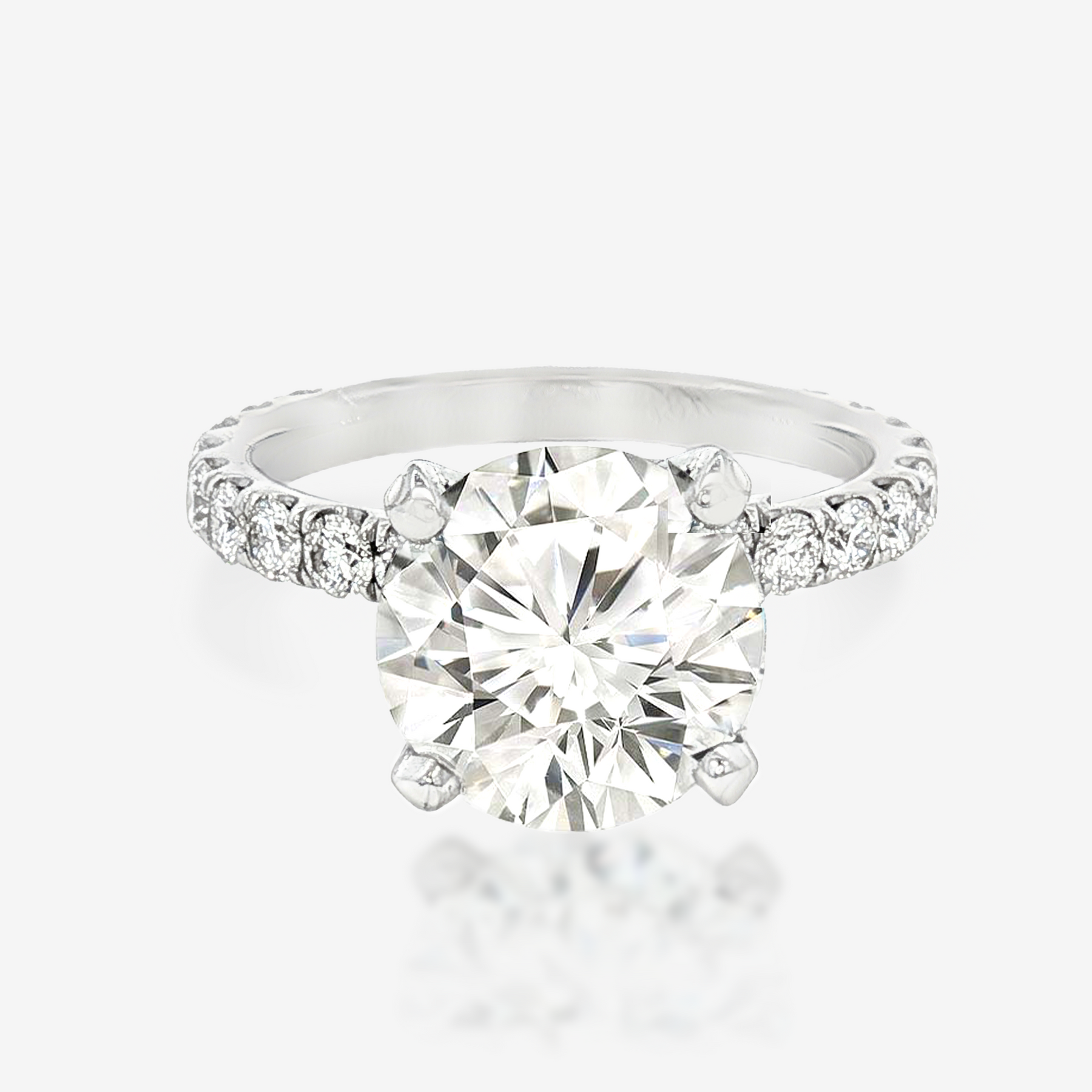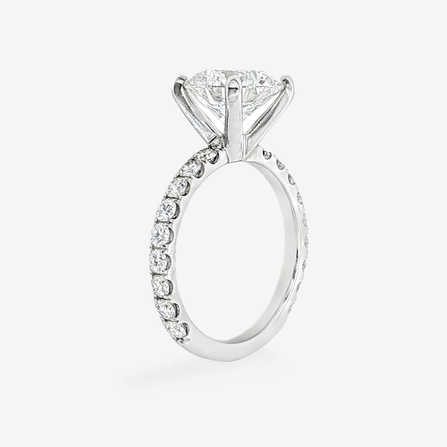 This Lab Grown Diamond round brilliant cut diamond in our Salute XL Collection. An 18K white gold engagement ring that commands notice! Special attention has been taken to slightly lower and contour the center prongs. Diamonds on the band are spaced to pay tribute to the beauty of your stone.
