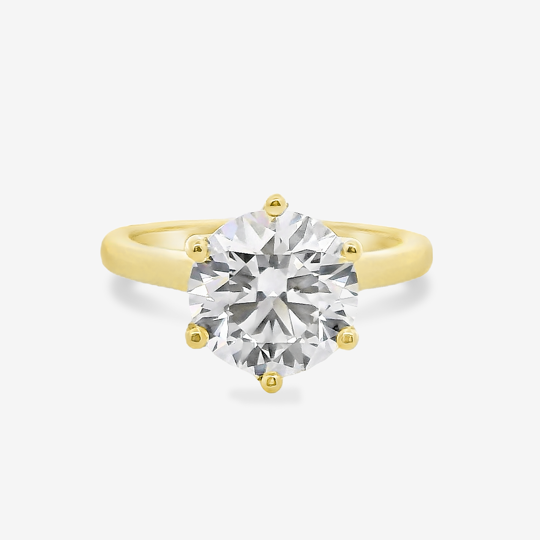 This Lab Grown Diamond set in our Tulip Six Prong Collection, round brilliant engagement ring is a nature inspired design with six blooming prongs. 18K yellow gold simplicity solitaire with subtle added detail.