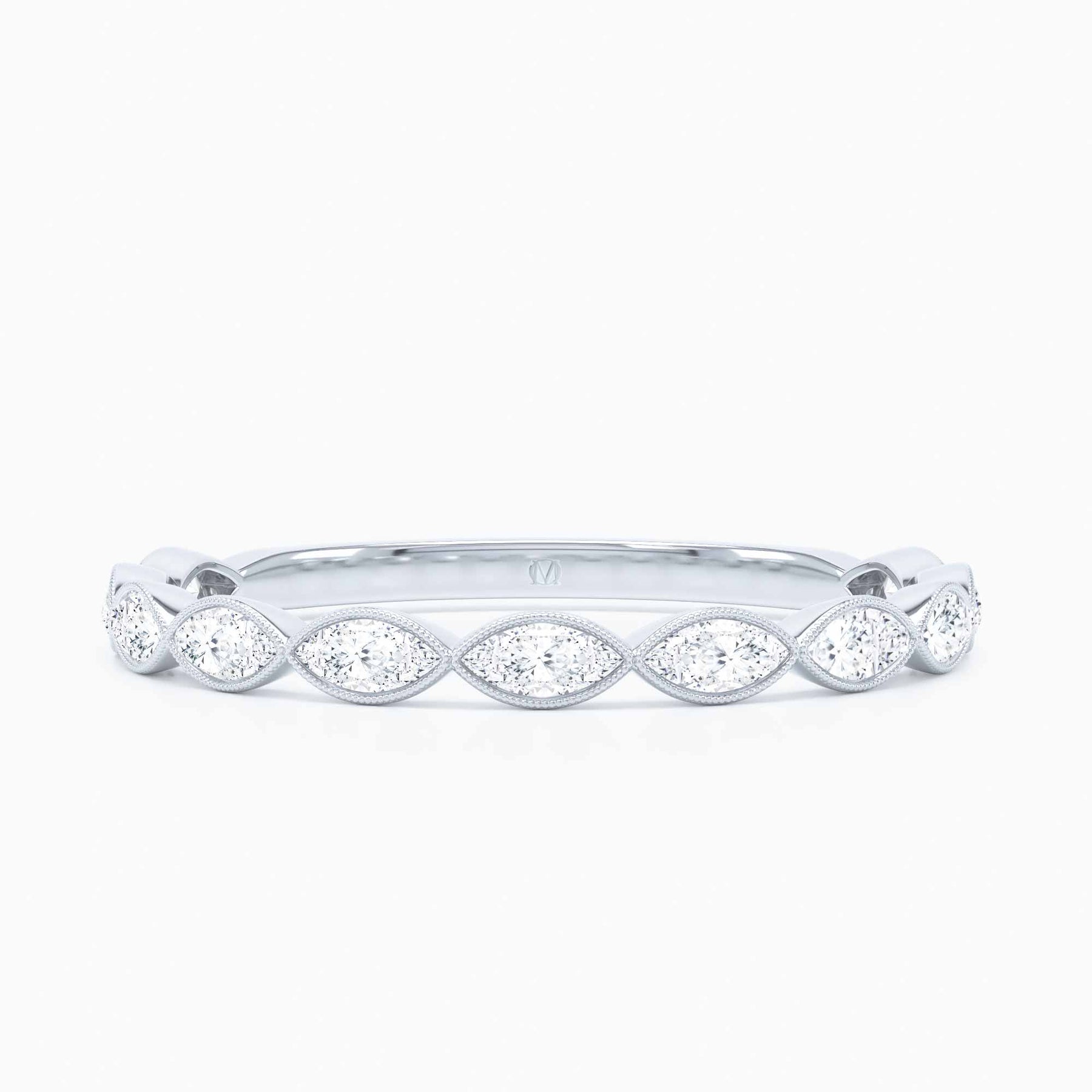 This customizable wedding band features natural, Marquise-cut diamonds set East - West in bezels with milgrain detail.